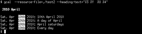 Change fixed date header list. That fixed date list heading is pretty ugly, don’t you think? What happens when you call Gcal with --heading-text="%3 %Y %U %4"? You can see the output below. It makes for a more appealing view of events. To learn about heading modifiers, look here (and search for heading).