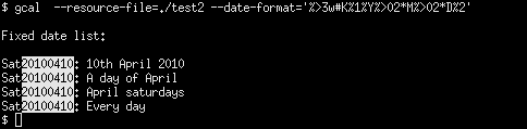 You can also see how to call Gcal to open a resource file: with either --resource-file or the -f commands. To display the fixed date list (i.e. what there is in the resource file) you need the -c command, and -cd or -ct would only list today and tomorrow, respectively. The command shown is -cdl@t55 which stands for show today and 55 days ahead starting from tomorrow.