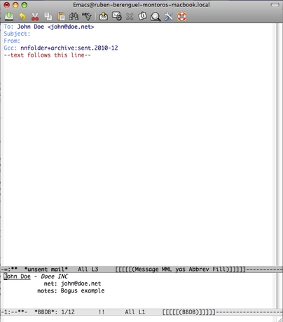 This means that my database keeps automagically in sync from my [netbook](http://www.amazon.com/gp/product/B0041K3CGO?ie=UTF8&tag=rbersblog-20&linkCode=as2&camp=1789&creative=390957&creativeASIN=B0041K3CGO) and my [MacBook](http://www.amazon.com/gp/product/B001GCTT7G?ie=UTF8&tag=rbersblog-20&linkCode=as2&camp=1789&creative=390957&creativeASIN=B001GCTT7G). Now that everything looks fine, let's check [gnus bbdb integration](http://www.mostlymaths.net/2010/12/emacs-30-day-challenge-using-gnus-to.html). M-x gnus, open some email from your inbox and press : (colon). Voilà! You should have a newly created buffer with an automatic bbdb entry for the mail sender. You can edit the newly created record with e or add a new field with C-o. Also, delete the current field with d, and the current record if you are in the first field. For more information, press C-h m.