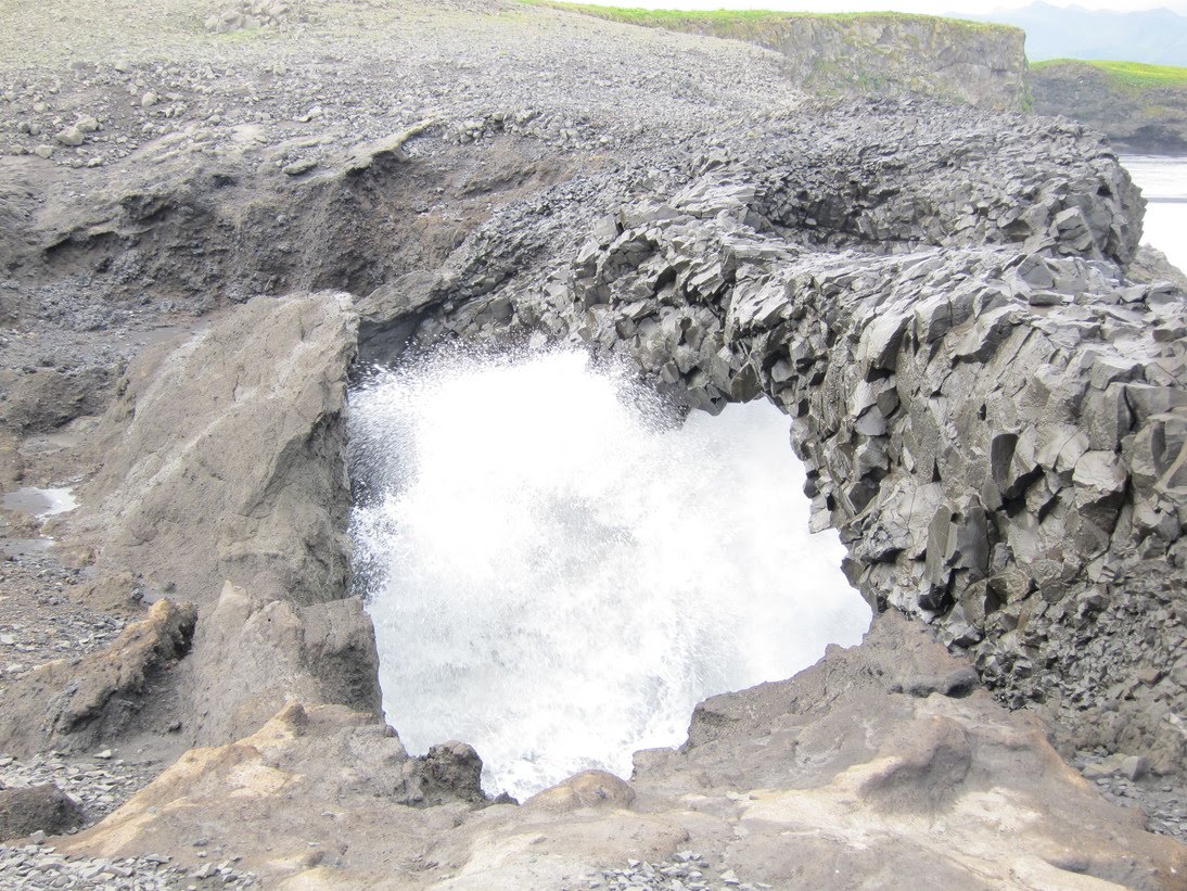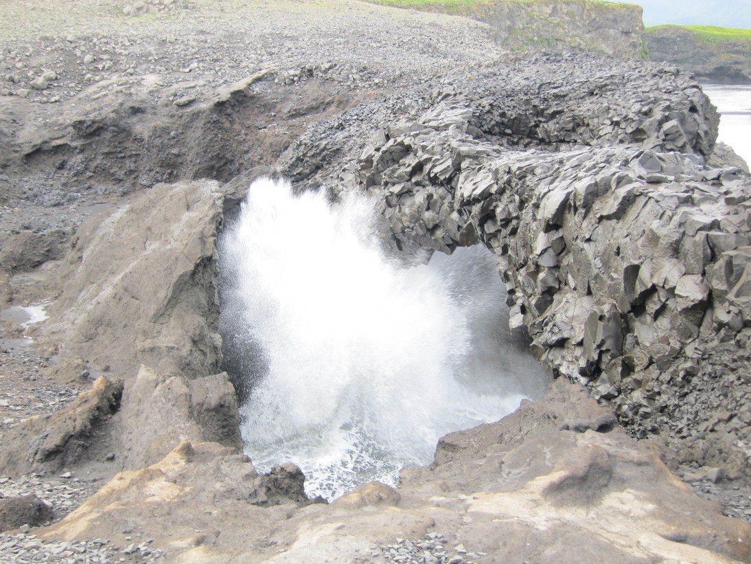 Going to the left of the road you get to the other side of Dyrhólaey, another small cape with very interesting views and an odd phenomenon: a sea geiser. When the strong wind, sea level and the rock formation coincide, they just form sea water gushes into the air. We were there at around 6pm, and it looked like a very good time to see that happen. Below you can see several shots of this event.