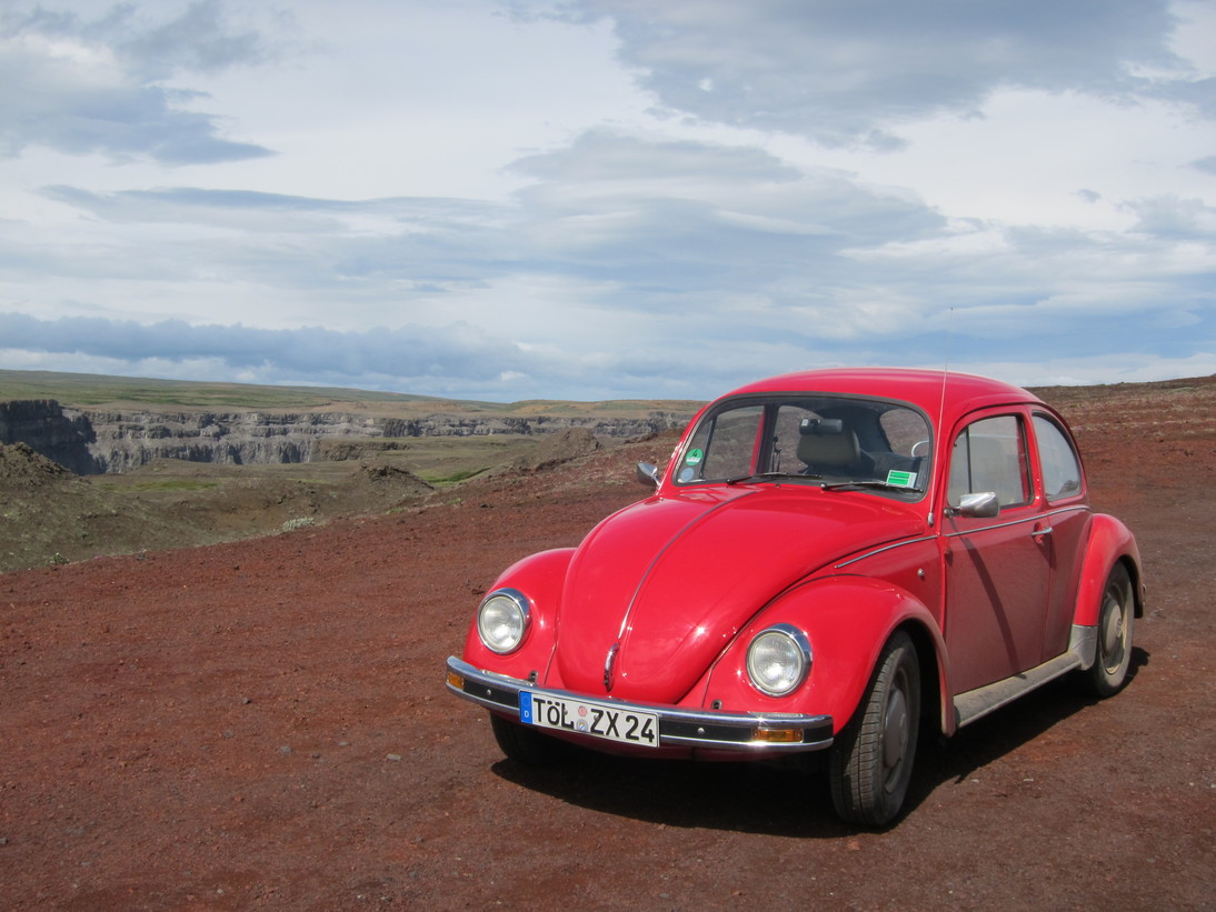 What can I say about Dettifoss? Well, it wasn’t that impressive after Gullfoss and that beautiful after Svartifoss. It was a good sight nevertheless, and it was just along the way to the Ásbyrgi. The road before the watching area was a little rough, red volcanic rock. And when we arrived we found a red Volkswagen Beetle from the 70s… Coming from Germany!