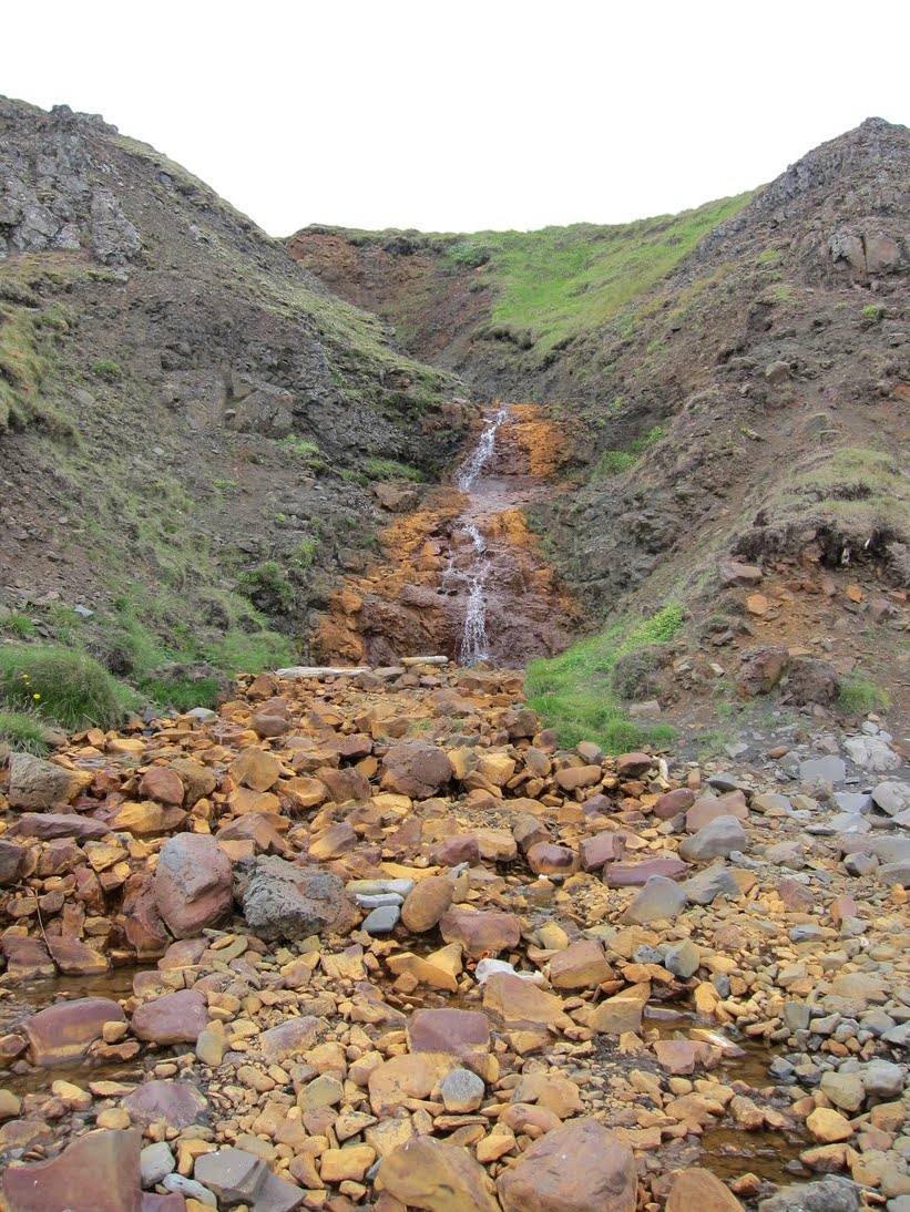 We had to run for our heads' sake a few moments before reaching the beach in front of the Hvítserkur, where we collected rocks and seashells. Facing the prospect of more attacks, we climbed the wall in front of it. An interesting feature is the small waterfall in front of the rock, beside the downward path. It was probably due to the recent rain.